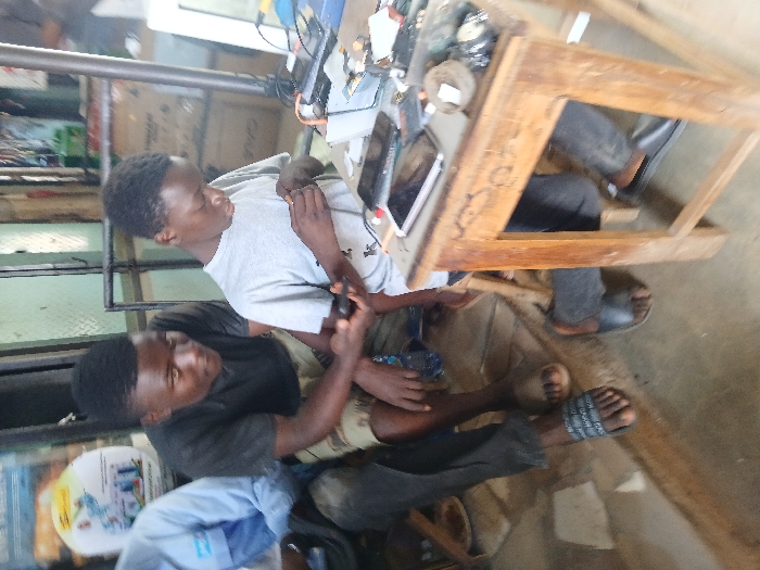 The scene depicts an indoor setting, identified as Plumtree, Zimbabwe, likely an electronics repair shop or market stall