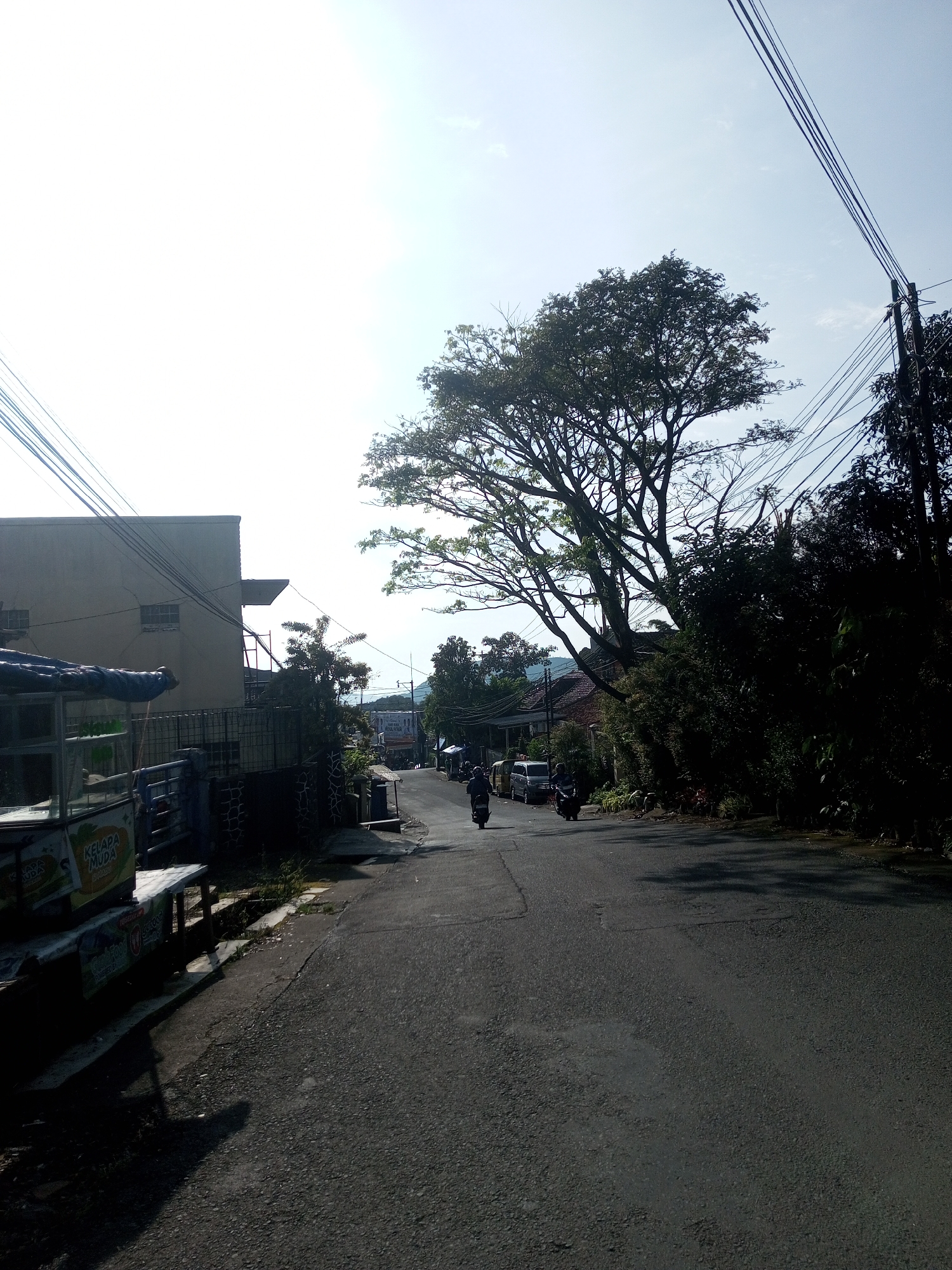 The image depicts a street scene in Nhot Chang, Laos. The road is asphalt, showing signs of wear. A person on a moped is traveling up the street, and another vehicle is further ahead. On the left side of the road, there is a building with a makeshift food stall in front. Overhead power lines are visible, crossing the sky. A large tree overhangs the street, casting shadows. The sky is bright, suggesting daylight. The overall scene indicates a residential or suburban area.