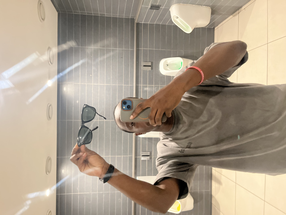 A man takes a selfie in a restroom mirror. He holds sunglasses in one hand and his phone in the other, capturing his reflection. The restroom features gray tiled walls and a white urinal, hand dryer, and flush mechanism. The man wears a gray shirt and a pink bracelet. The lighting is bright, casting reflections on the mirror. The picture is rotated for perspective.