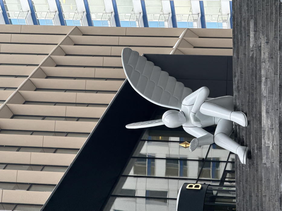 A modern white angel sculpture with stylized wings and body is mounted on the corner of a building