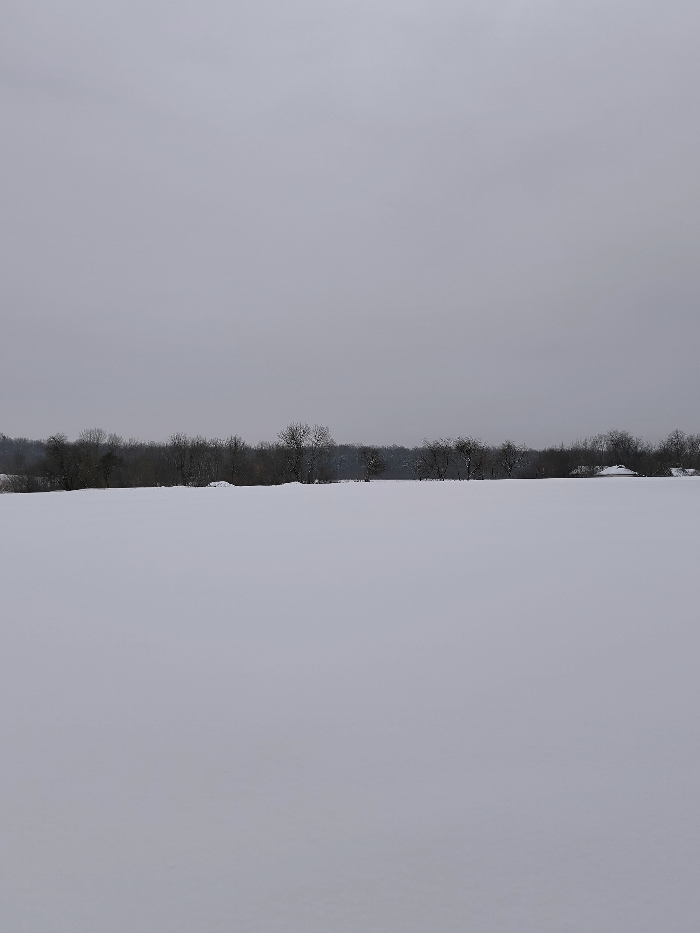 The image displays a winter landscape in Parkhomivka, Ukraine, under an overcast sky. The lower half of the frame features an expansive, unbroken field of white snow covering level ground. No tracks or disturbances are visible on the snow surface. Along the horizon, a dense, irregular line of predominantly bare deciduous trees, with some evergreen foliage interspersed, forms a dark band. Snow is present on the branches and at the base of these trees. The upper half of the frame consists of a uniform, light grey, overcast sky. The scene is illuminated by diffused, ambient light. No people, animals, or man-made structures are visible.