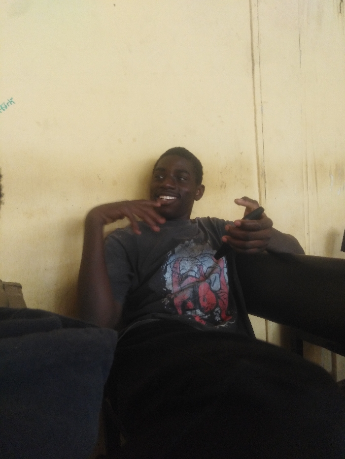 A young male individual, appearing to be in his late teens or early twenties, with dark skin and short dark hair, is seated against a light yellow wall that exhibits discoloration and vertical striations