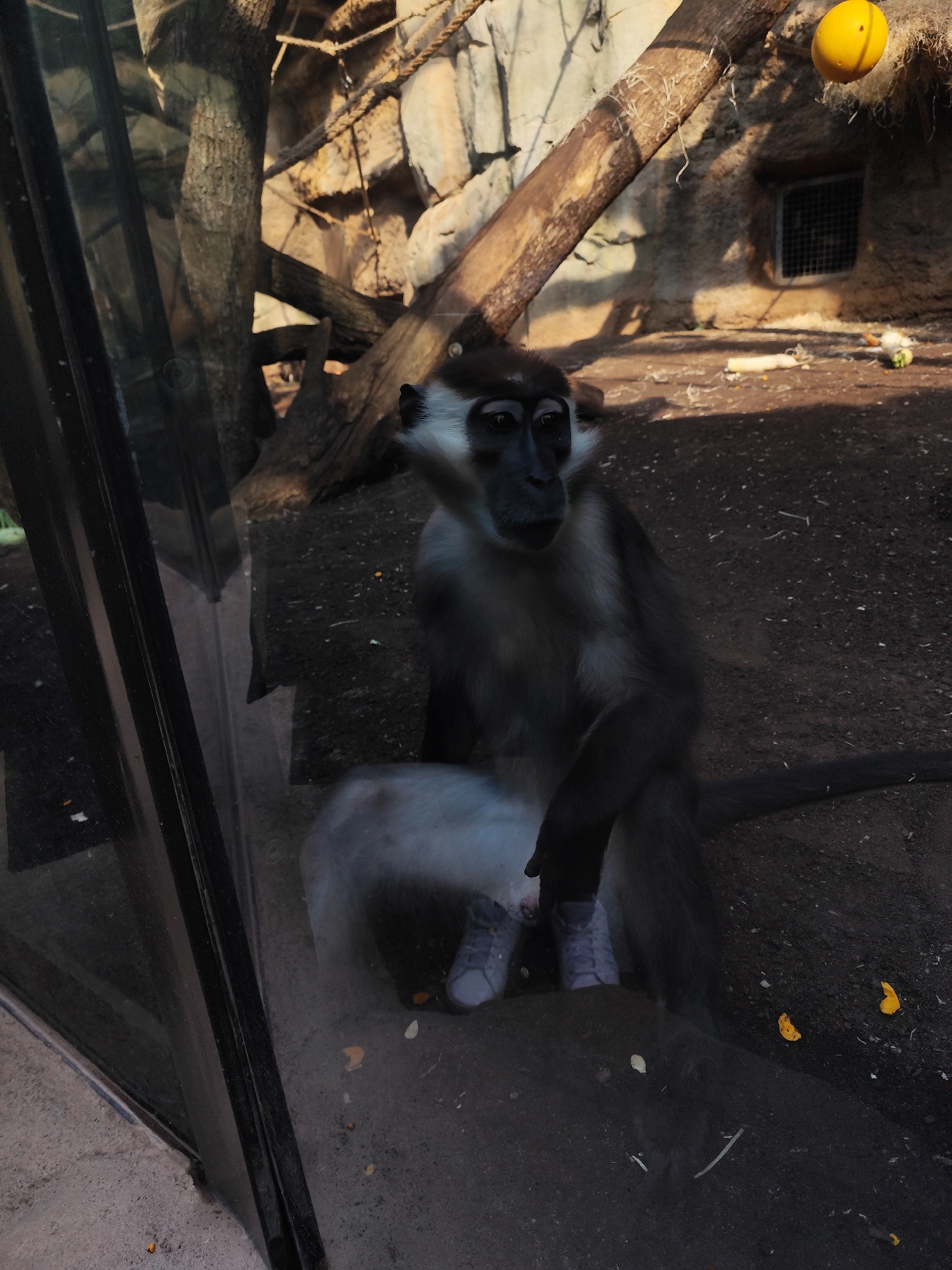- "An adult primate, likely a guenon or similar monkey species, is seated on dark, earthy ground within an animal enclosure at the Frankfurt Zoo in Frankfurt, Germany" by FM-GiKA22, licensed under CC BY 4.0