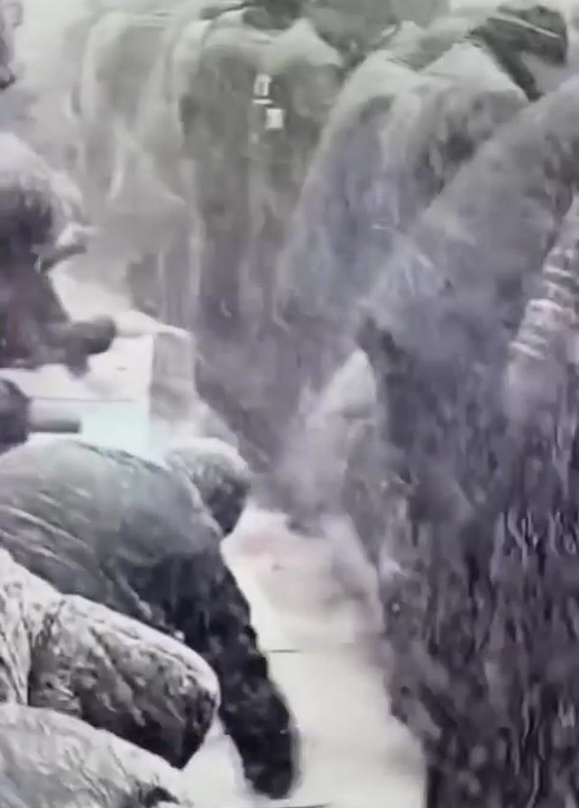 large group of people outdoors during heavy snowfall. The individuals are bundled in winter clothing, making it difficult to distinguish specific features. Some people are kneeling, seemingly interacting with the snowy ground. The environment is dense with falling snow, obscuring the background details, though street lamps are visible, suggesting an urban or suburban setting.