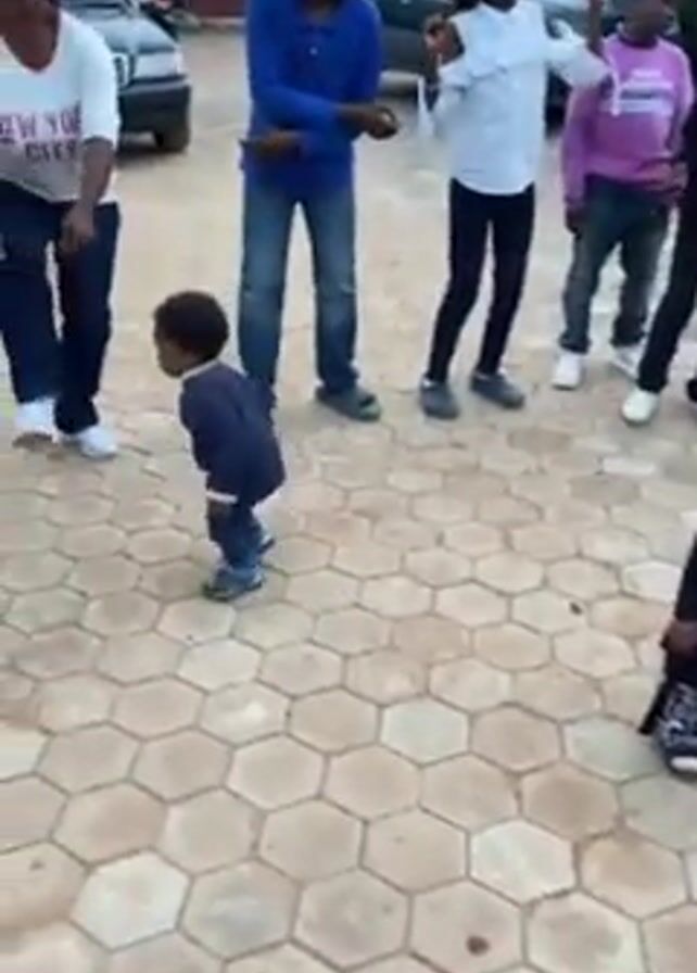 A group of six adults and children are dancing on a patio paved with hexagonal stones. The group is dancing in a circle, with a small child dancing in the center. The child is wearing a blue sweater and jeans, and blue shoes. Two cars and a house can be seen in the background. The light suggests it is daytime.