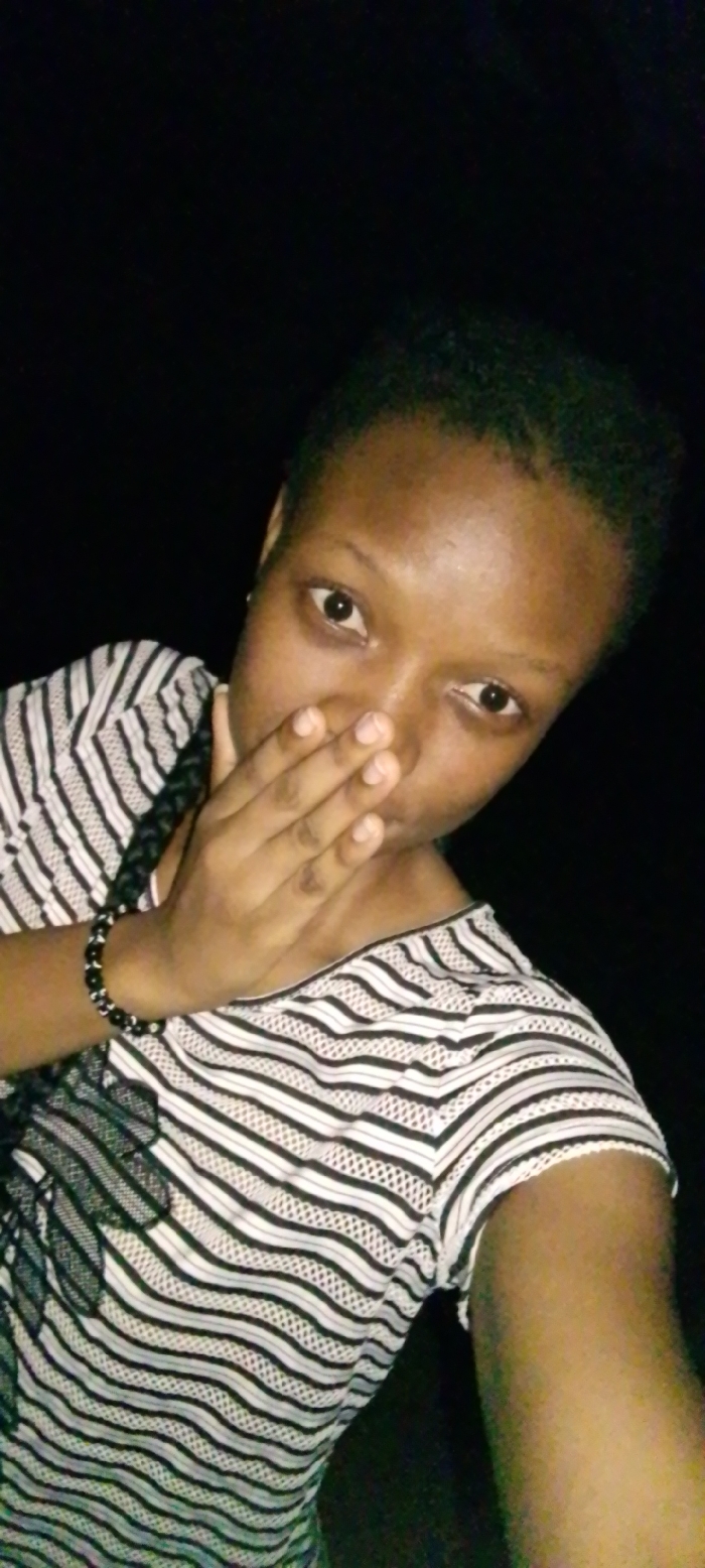 A dark-skinned individual, gender indeterminate, with short dark hair, is depicted in a medium close-up, gazing directly into the camera. The scene is underexposed, with the background appearing completely black. The individual's right hand is raised, covering their mouth and chin. They are wearing a short-sleeved top featuring a pattern of alternating black and white horizontal stripes; some white stripes have a small, dark mesh-like texture. A dark, possibly black, beaded bracelet with lighter accents is visible on their left wrist. A dark, braided strap is visible over their left shoulder. The lighting suggests a direct flash or artificial light source illuminating the subject against a dark environment. The location is Aba, Nigeria.