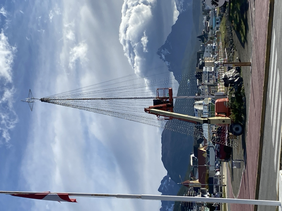The image displays an outdoor urban scene in Ushuaia, Argentina, under a partly cloudy sky