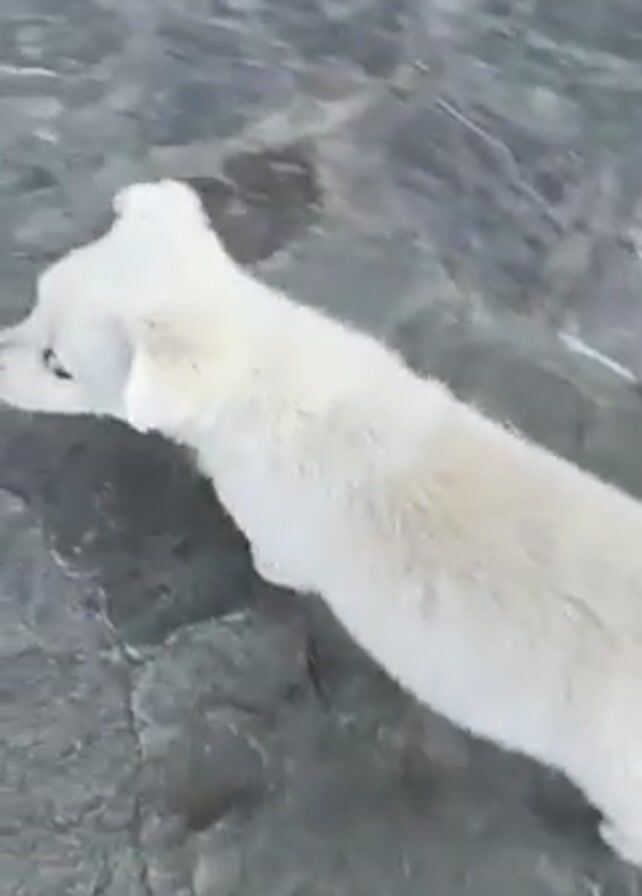 A video shows a fluffy, white puppy walking around on a gray, stone-tiled floor