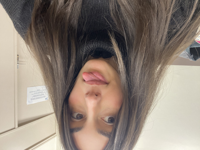 A female subject, centered in the frame from the chest up, is depicted indoors within a building belonging to the University of Montpellier, France. She possesses long, dark brown hair parted on the side, and is wearing a black turtleneck sweater. Her expression involves extending her tongue forward and looking towards the right side of the frame. The background consists of a light beige wall and a matching door to her right. A white, rectangular notice, likely laminated, is affixed to the door. Text on the notice, partially visible, includes the phrase "L'université de Montpellier recommande le port du masque dans ses locaux...", confirming the university setting. An indistinct dark object is partially visible in the lower left background.