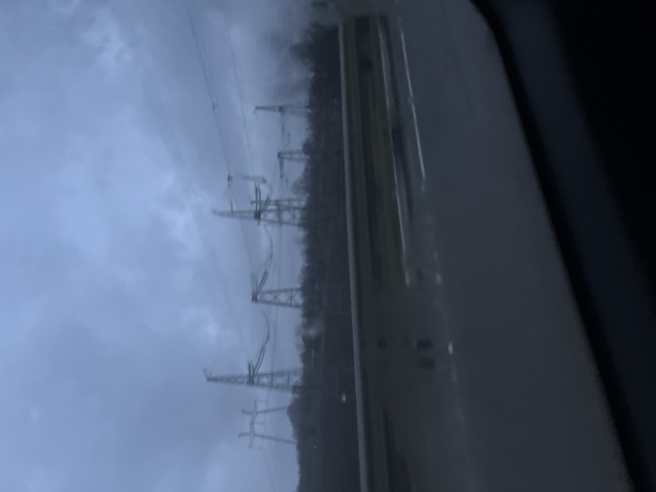 A gray, overcast sky looms over a line of electrical towers extending into the distance. The structures are thin and metallic, carrying power lines across a landscape blurred by rain or fog. Dense trees fill the space between the towers. The photograph appears to have been taken from inside a vehicle, as a portion of the window frame is visible on the right side, with water droplets adding to the indistinctness.