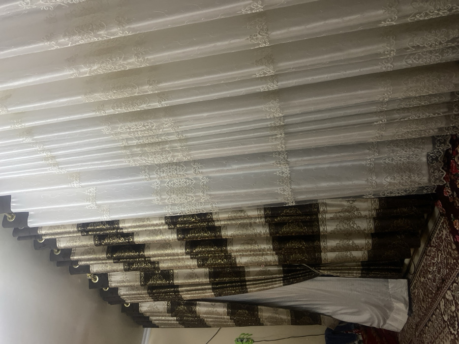 The image displays textured white and striped brown and beige curtains. The white curtains have a delicate, repeating pattern. Below, the striped curtains exhibit alternating brown and beige sections, with a shiny or textured appearance. The bottom of the curtains is partially obscured by a white sheet. A patterned rug or carpet is visible along the right edge, suggesting a room setting.