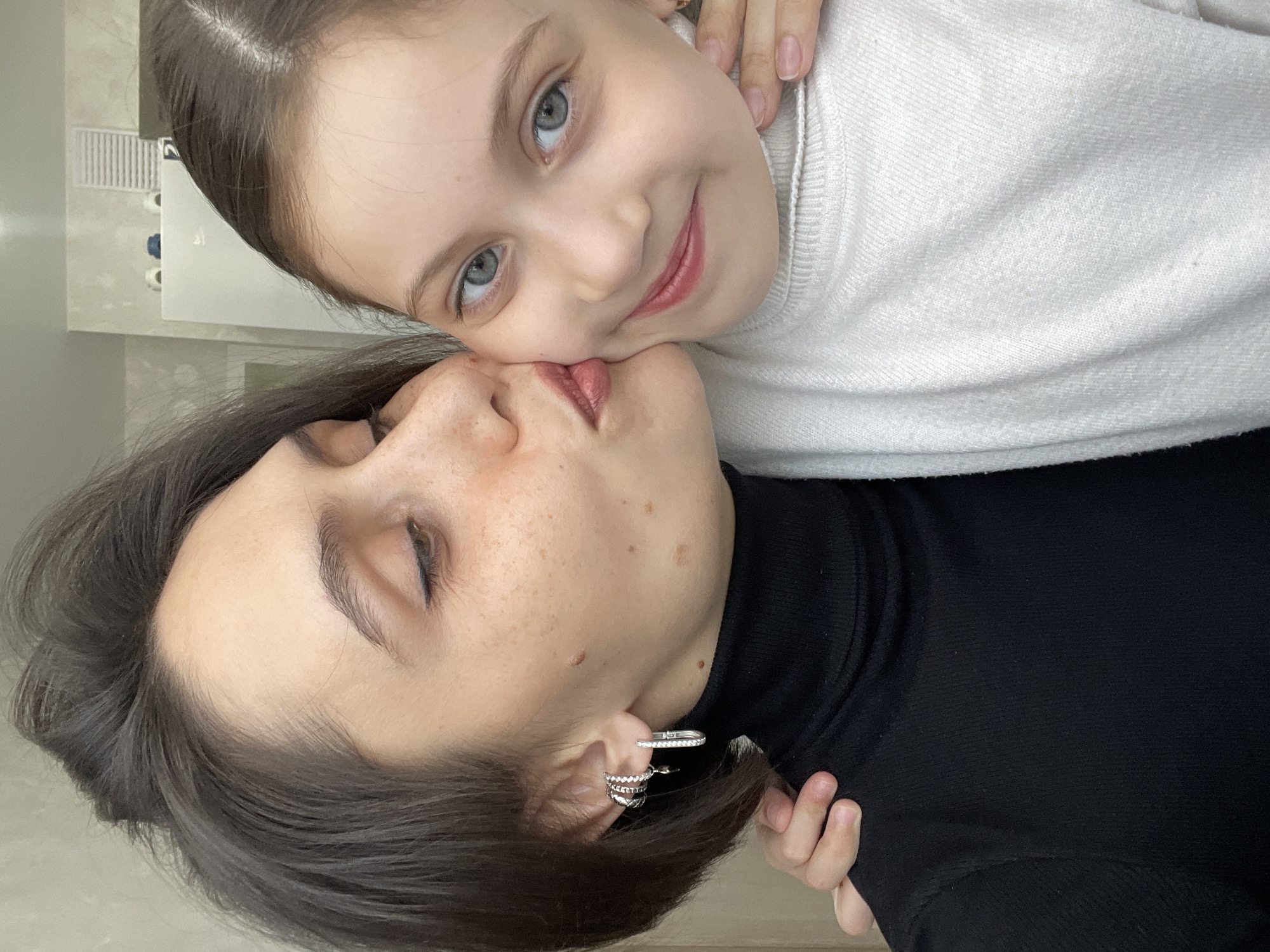 A young girl with blue eyes and a white sweater is resting her face on her mother's face. The mother has dark hair and is wearing a black turtleneck sweater and silver earrings. They are close, and the girl has a gentle smile. The location is unclear, but it cannot be determined to be Izhevsk, Russia without additional information.