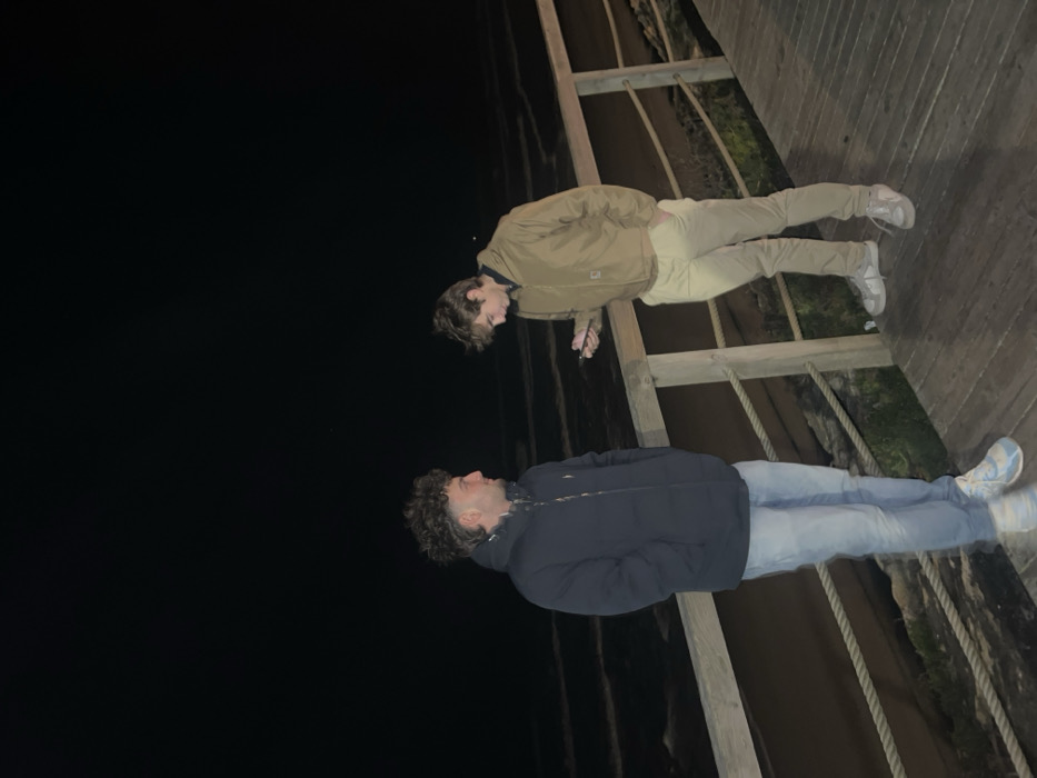 Two young men stand facing each other on a wooden walkway at night. One wears a tan jacket and light-colored pants, looking down. The other wears a dark blue puffer jacket and jeans, gazing upwards. The walkway has a simple wooden railing with ropes. Beyond the walkway is a dark, undefined area. The dark sky occupies a significant portion of the upper left frame.