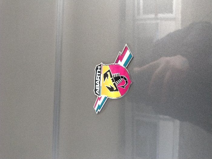 The image displays a close-up, eye-level view of a colorful Abarth emblem affixed to a metallic grey surface, likely a vehicle's body panel
