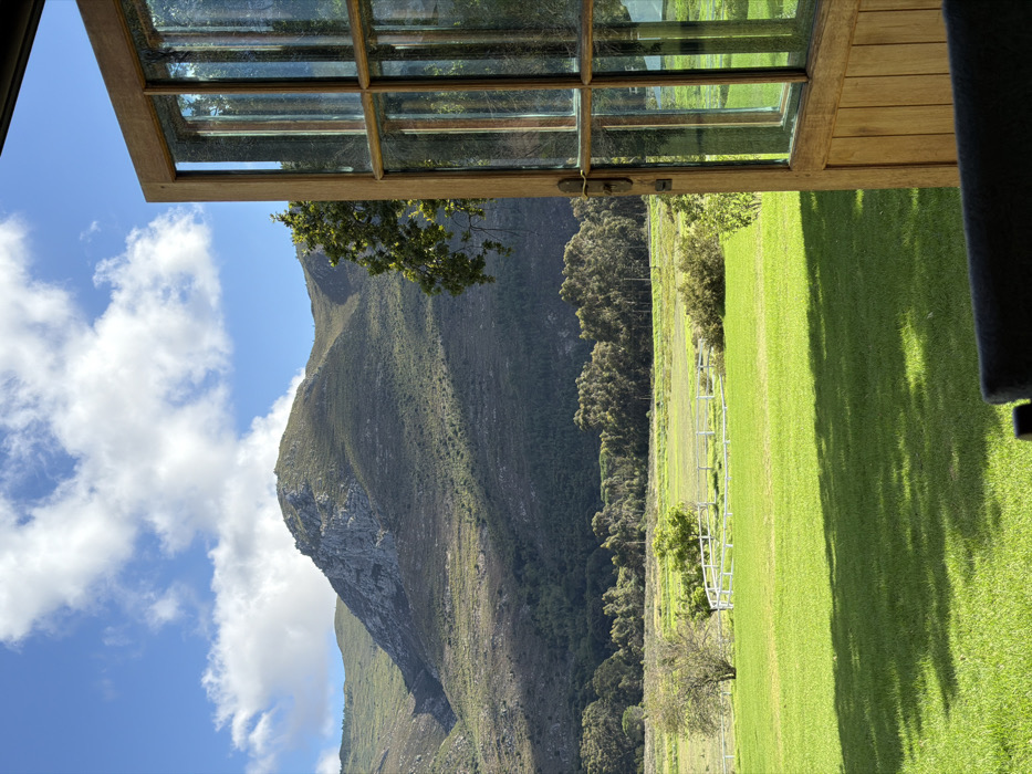The image depicts a panoramic outdoor landscape viewed through a partially open, light-brown wooden door with multiple glass panes, positioned on the right side of the frame. The scene is set in Overstrand Nu, South Africa. In the immediate foreground, a meticulously maintained, vibrant green lawn is visible, featuring distinct, elongated shadows cast by an unseen object or structure. Beyond the lawn, a expansive, lighter green field or pasture is present, segmented by white, multi-rail fences suggesting enclosures. Several trees, some with sparse foliage and others more robust, are scattered across this mid-ground field. Further back, a dense line of tall, predominantly evergreen trees forms a natural barrier at the base of a significant mountain range. The mountains dominate the background, characterized by undulating slopes covered in scrubby vegetation. A prominent central peak displays exposed, light-grey rock formations. Areas of the mountain slopes are illuminated by direct sunlight, while others are in shadow, indicating a clear, sunny day. The sky above is a bright blue, dotted with scattered white cumulus clouds. No individuals or active interactions are visible. A dark, possibly upholstered object is partially visible in the bottom right corner, suggesting an interior vantage point. The metallic handle of the wooden door is visible, along with reflections on its glass panes.