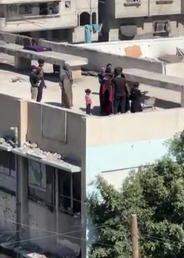 group of people, including children, standing on the rooftop of a building. They are mostly dressed in casual clothing. The building appears to be in an urban area, with other buildings visible in the background. The surrounding buildings show signs of damage and impact, with rubble, chipped concrete, and broken windows. Some trees are visible in the lower right corner of the frame. There is a loud explosive sound.