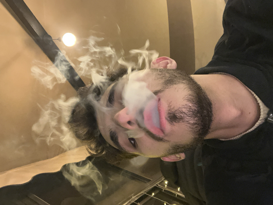 A man with dark curly hair and a beard blows a cloud of smoke directly at the camera