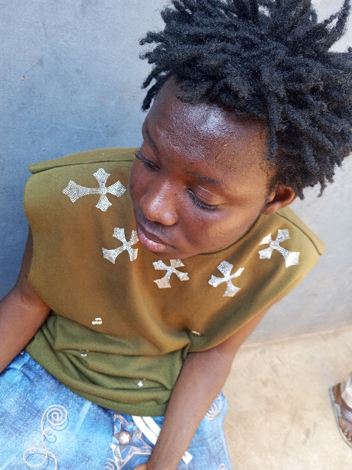 The image, taken from a high-angle perspective, depicts an individual in the city of Akwanga, Nigeria. The subject has dark skin and short, dark, tightly coiled hair. Their forehead and face exhibit a glossy appearance. The individual's eyes are downcast, directing their gaze towards the lower right, and their lips are closed. They are dressed in a sleeveless, olive-green top adorned with multiple silver-colored, stylized cross motifs featuring flared ends. Below the top, blue patterned trousers or a skirt with white swirling designs and geometric shapes are visible. The individual's right forearm is visible, resting across their upper leg area. The background consists of a light gray to bluish-gray wall behind the subject and a beige-colored ground. A portion of a foot, clad in a light brown sandal, is discernible in the lower right corner of the frame.