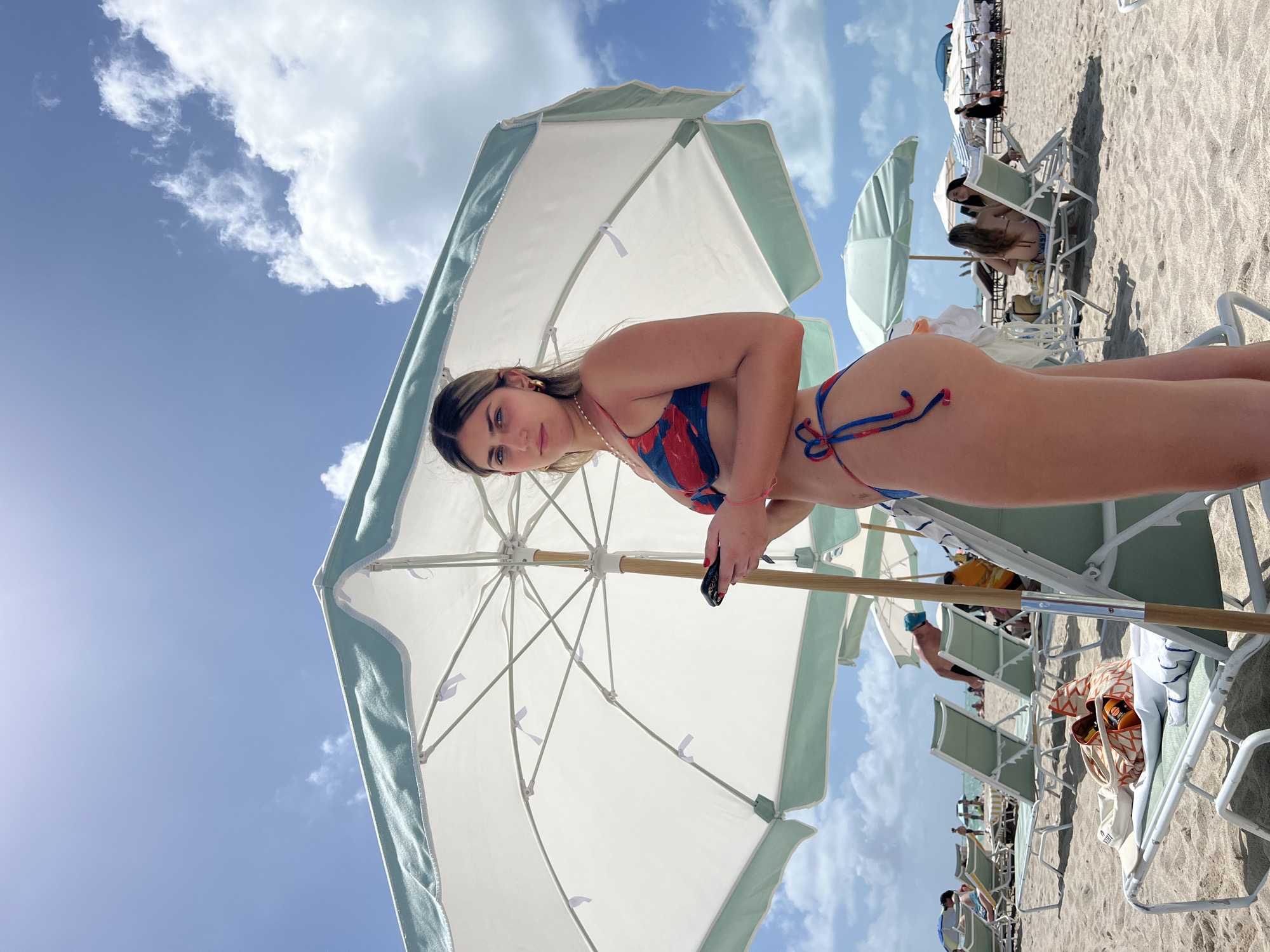 The image captures a woman in a bikini lying on a beach chair under a large white and green umbrella. She is fair-skinned with dark hair, and looks directly at the camera. In the background, there are other beach umbrellas, chairs, and people, indicating a crowded beach setting. The sky is visible with scattered clouds. Given the mention of Miami Beach, United States of America, it is likely the scene is a public beach located there.