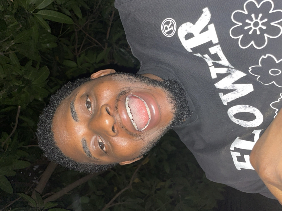 This image depicts a single male individual positioned in what is stated as the city of Akwanga, Nigeria, against a dark, outdoor background with visible foliage. The individual, appearing to be an adult of African descent, is seen from the chest up, positioned slightly below the camera lens, looking upwards and directly into the camera. He has dark, short, curly hair and a neatly trimmed beard and mustache. His mouth is wide open, revealing his upper and lower teeth, gums, and tongue. His eyes are wide open, and his expression conveys excitement or laughter. He is wearing a dark-colored, possibly black, long-sleeved shirt. The shirt displays white graphics: a registered trademark symbol (R in a circle) on the upper right chest, and below it, the word "FLOWER" in a stylized, somewhat distressed font, followed by multiple white floral designs with distinct petals and centers. The lighting suggests artificial illumination, likely a flash, given the brightness of the subject against the dark background. No other individuals or specific man-made objects are identifiable in the background.