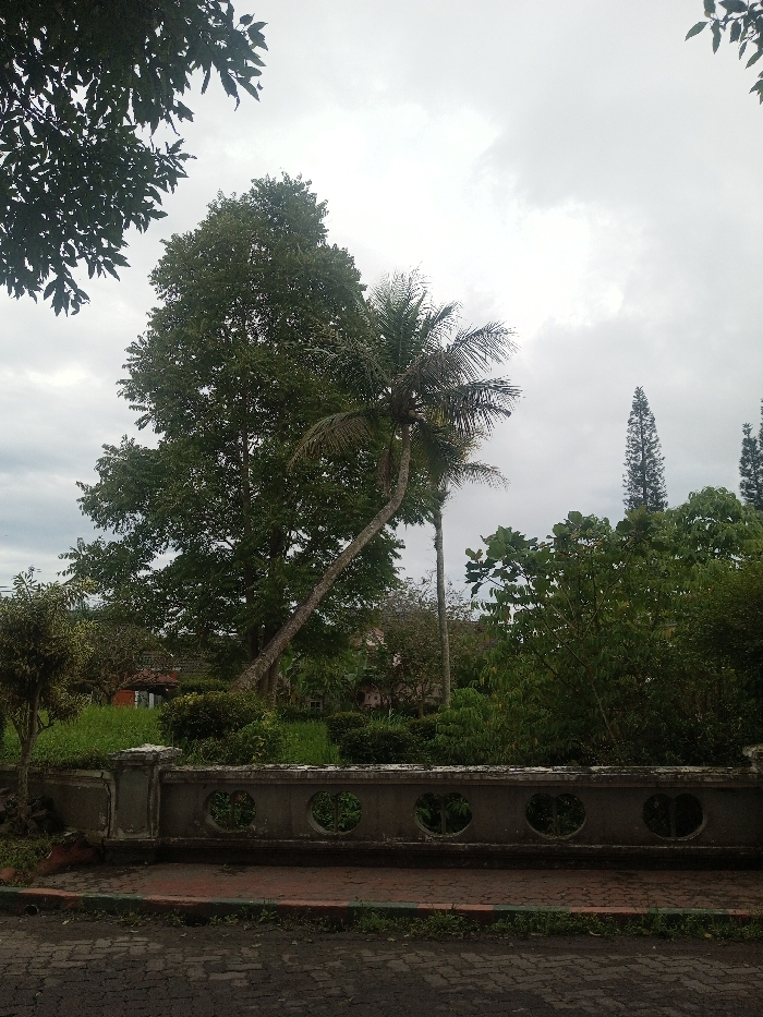 The scene depicts an outdoor tropical environment in Cipanas, Indonesia, under an overcast sky. In the foreground, a dark, textured paved surface, likely asphalt or cobblestone, occupies the lower portion of the frame. A narrow strip of green foliage, possibly grass or weeds, borders the paved area, followed by a low, light-grey concrete wall. This wall features multiple circular openings as decorative elements and shows signs of weathering. Behind the wall, dense, vibrant green foliage dominates the midground and background. A tall, broad-leaved tree stands prominently on the left side of the frame, its canopy full and dark green. To its right, a distinct coconut palm tree with a noticeably curved trunk leans towards the right, its fronds partially visible. Another straighter, slender palm tree is situated directly behind the leaning one. Further to the right, two tall, coniferous trees with narrow, pointed crowns rise against the sky. Various other shrubs and smaller trees form a dense undergrowth. Portions of structures are visible amidst the foliage in the background: a building with a reddish-brown roof and light-colored walls is partially obscured on the left-mid background, while other faint structural outlines are suggested further right. The sky is uniformly light grey with visible cloud cover, indicating an overcast condition. No individuals or active subjects are present in the frame.