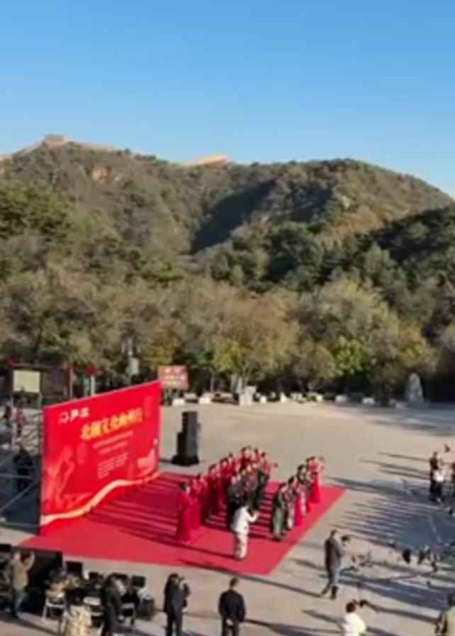Here is a detailed description of the scene in the video: The scene is an outdoor gathering at a location that seems to be near a section of the Great Wall of China, which can be seen in the background atop a tree-covered hill. The sky is clear and bright blue. In the foreground, a group of people are gathered on a large paved area. A red carpet leads up to a small stage that has a red backdrop with Chinese characters on it. There appears to be a choir group on the stage, some of whom are wearing red outfits and others are in green. A person in white seems to be leading them, possibly as a conductor. Around the stage and the red carpet, there is a crowd of people standing, watching, and taking photos or videos with their cameras and phones. Some of the people in the crowd are wearing red hats or red clothing. There are also some professional-looking camera operators. The overall atmosphere suggests a cultural event or performance taking place at a significant location.