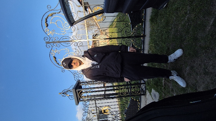 An outdoor, full-length, eye-level photograph captures a male subject standing on a patch of sparse grass and dirt in Isperih, Bulgaria. The subject is positioned centrally, facing forward, with his hands in his pockets. He wears a black baseball cap with a white emblem, dark sunglasses, a white hooded sweatshirt beneath a black zippered windbreaker jacket, black track pants, and white high-top sneakers with black accents. Behind the subject is an ornate black wrought-iron gate with gold decorative elements, including stylized horse head motifs. To the left of the subject, a black gate pillar is visible. Beyond the gate, a residential property with a light-colored building and a white wall with gold accents is present. Bare tree branches are visible above the wall. On the far right, the open rear door of a dark-colored vehicle is partially visible. The sky is bright blue with scattered white clouds, indicating clear daytime conditions.