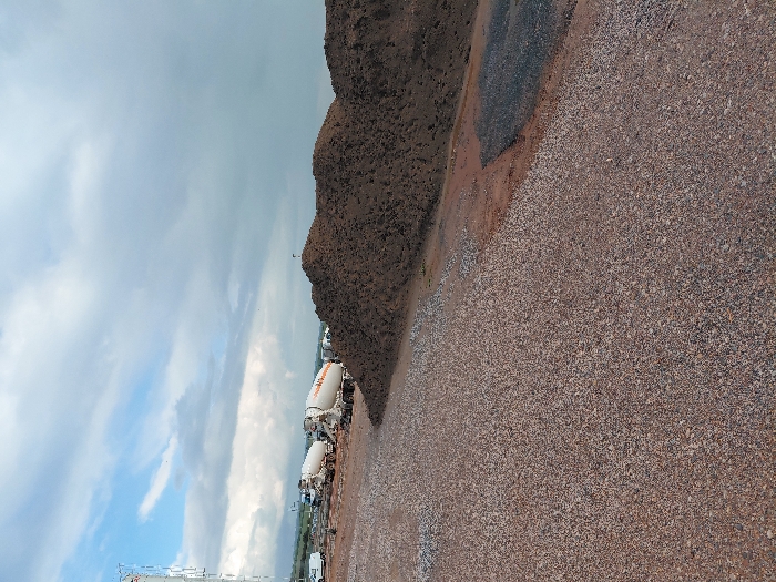 The scene depicts an outdoor construction or industrial site in Bni Yakhlef, Morocco. The foreground is dominated by an expanse of reddish-brown gravel and aggregate material, extending from the bottom left towards the center. To the right, a large, irregularly shaped mound of dark brown soil or earth rises significantly, partially obscuring the background. Behind this earth mound and positioned in the midground to the left, several heavy vehicles are visible: at least three white cement mixer trucks with prominent orange lettering on their rotating drums are parked. A white utility van is partially visible further to the left, adjacent to what appears to be a lattice-style tower or scaffolding structure. The distant background reveals a flat landscape with hints of green vegetation under a sky characterized by a mix of blue and extensive greyish-white clouds. No individuals are present in the visible area of the scene.