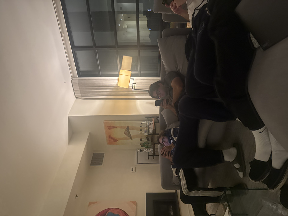 This image depicts an interior scene, likely a residential apartment or condominium, situated in an urban area of Boston, United States. The time is nighttime, with dim artificial lighting providing illumination. The scene features a modern living space with light-colored walls and a high ceiling. In the foreground, three individuals are positioned on grey upholstered sofas, all engaged with smartphones. The person closest to the camera is partially visible, showing legs clad in dark pants and white socks, with dark slippers/shoes. To their left, another individual reclines on a sofa, wearing dark pants, white socks, and sandals, a dark t-shirt, and glasses, looking down at a smartphone held in both hands. Further left, a third person is also reclining, wearing glasses and a striped top, actively using a smartphone. A fourth individual's hand and smartphone are partially visible on the far right. To the left, a built-in electric fireplace is visible beneath a large, colorful circular abstract artwork. Above this, a rectangular air vent is present. Next to the fireplace, a two-tiered bar cart or shelving unit holds multiple liquor bottles (including Grey Goose and Belvedere) and what appear to be glasses. The right side of the room features a large window with dark frames, divided into multiple panes, partially covered by vertical sheer curtains. The window reflects interior lights and appears to show another building's interior or a hallway, indicating an urban setting. A modern floor lamp with two rectangular, angled shades provides a warm glow near the window. A glass coffee table is present in the immediate foreground. The overall environment is one of relaxed, individual technological engagement within a contemporary living area.