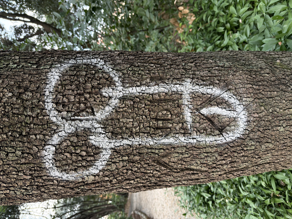 A vertical image depicts a tree trunk in a park or natural area within Grad Opatija, Croatia. The trunk features deeply textured, grayish-brown bark. Prominently displayed on the trunk is a white spray-painted symbol resembling a stylized phallus. This symbol consists of two conjoined ovoid shapes at the top, a central vertical shaft, a horizontal line crossing the shaft mid-way, and a circular base containing an inverted triangular element. To the immediate left of this white graffiti, carved into the bark, are the letters "A" and "ID". No individuals are visible. The background on the left reveals a light-colored gravel path bordered by low green vegetation, leading into the distance. The background on the right shows dense green foliage and additional tree trunks. The foreground at the base of the main tree displays abundant green ground cover.