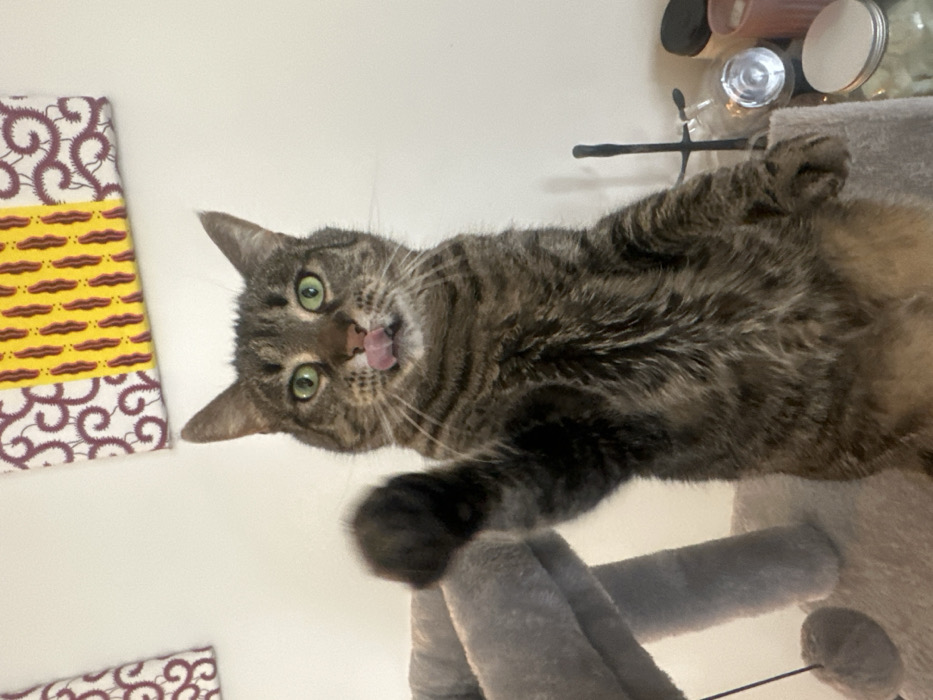 - "The scene portrays a domestic tabby cat, characterized by brown, black, and grey striped fur and prominent green eyes, situated within a presumed interior location in Châtenay-Malabry, France" by FM-sLbVd2, licensed under CC BY 4.0