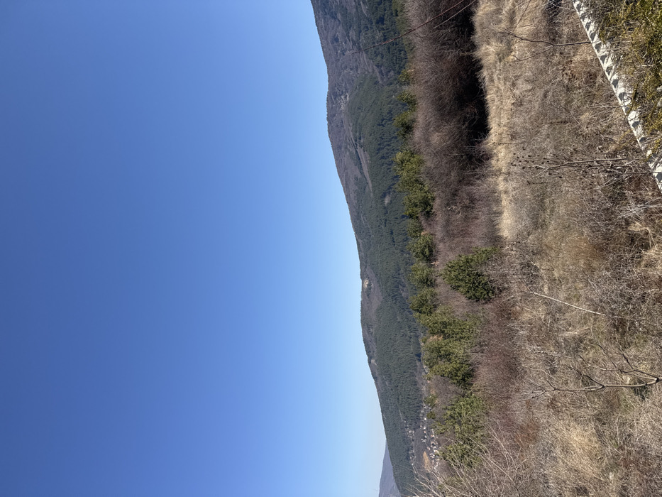 A wide-angle landscape photograph captures a mountainous vista near Kladnitsa, Bulgaria, under a clear, cloudless blue sky. The upper third of the image is dominated by the blue sky, which deepens in color towards the top of the frame. The mid-ground features a prominent mountain range stretching horizontally across the scene. These mountains are predominantly covered with dense, dark green coniferous forests. Patches of lighter, bare deciduous trees or areas of exposed ground are visible on some slopes, indicating a dormant season. To the far left, nestled on a lower slope, a settlement identified as Kladnitsa is discernible, characterized by a cluster of buildings with reddish roofs and light-colored walls, partially obscured by trees. The foreground and lower mid-ground consist of uncultivated terrain covered with dry, withered yellow-brown grass and numerous dormant deciduous shrubs and small trees exhibiting bare, brown, and reddish-brown branches. Scattered among this dormant vegetation are several small, green coniferous saplings. In the lower right corner of the frame, a segment of a grey concrete barrier or curb is partially visible, extending horizontally, partially obscured by foreground vegetation. The scene is illuminated by bright, high-angle sunlight. No people or active subjects are present.