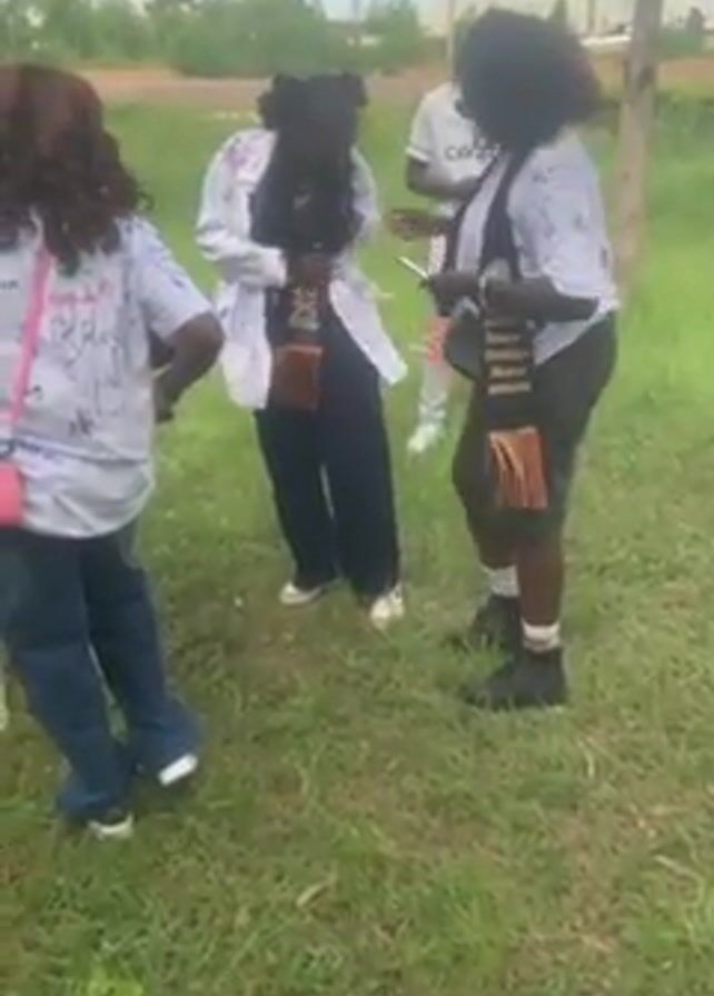 A group of people stand in a grassy area, possibly celebrating an occasion. Two women are in the foreground, each wearing a white shirt with writing on it and a decorative shawl-like accessory. The woman on the right is adjusting the other woman's shawl. Another person, also in a white shirt with writing, is partially visible to the left. In the background, a person in a white shirt is looking at a mobile phone. A cell tower is visible in the distance, along with a tree and a small building or wall. The scene appears to be outdoors on a cloudy day.