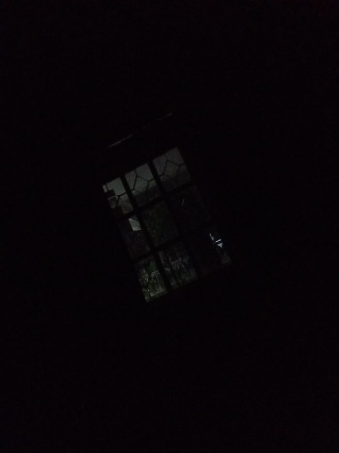 The image displays an extremely underexposed scene from an interior location in Qorday, Kazakhstan. A rectangular window is prominently featured, positioned diagonally in the lower-central portion of the frame. The window is divided by a dark grid structure, forming multiple panes. Through these panes, faint, indistinct outlines of outdoor vegetation, consistent with trees or bushes, are visible, illuminated by minimal ambient light. No individuals, specific objects within the interior, or discernible actions are present in the frame. The overwhelming darkness indicates either a nighttime setting or a severely unlit environment.