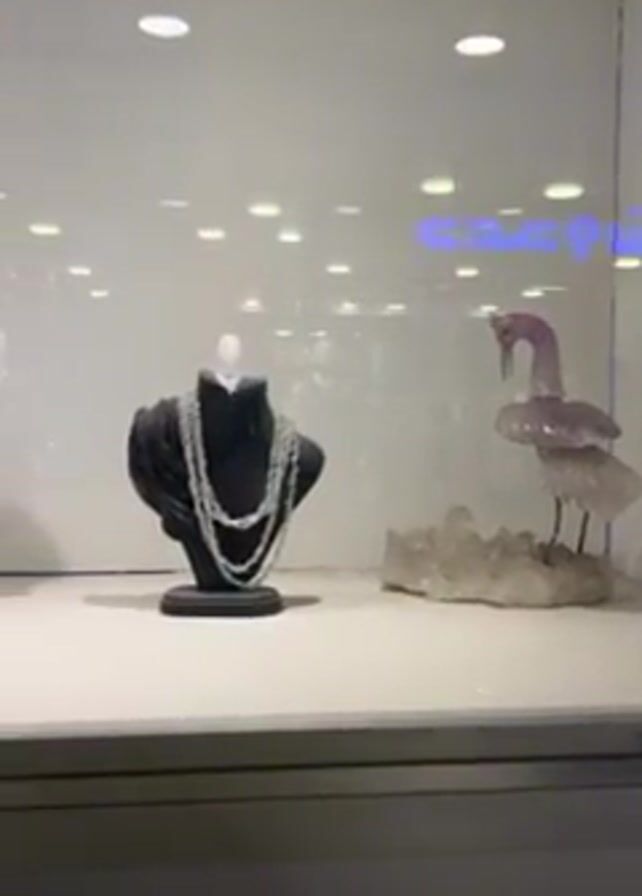 A slow pan showcases the contents of a lighted glass display case. Inside are several items. From left to right, there is a stone clock, a bust on which hangs a multi-strand necklace, and a purple crane figurine standing on a bed of quartz crystals. The display case sits atop a silver-colored cabinet. The reflections in the glass indicate that people are walking in front of the case.