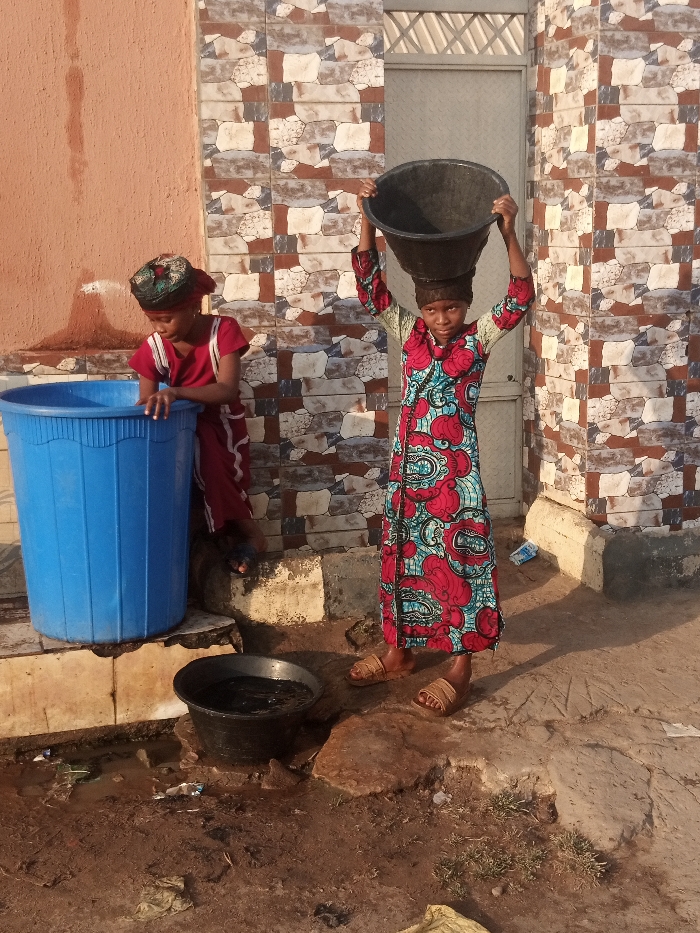 Two young girls are positioned outside a building. One girl is leaning against a large blue bucket, while the other balances a dark-colored bucket on her head. A smaller black bucket sits on the ground in front of them. The building's exterior features a mix of orange plaster and a patterned tile wall. The ground is muddy, and the lighting suggests an outdoor, daytime setting. Both girls are dressed in long garments, and the scene evokes a sense of daily life or work in a rural area.