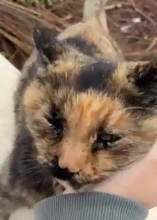 A short, eye-level video shows a person petting a calico cat outdoors