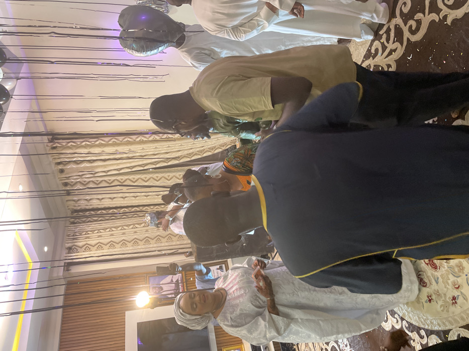 A group of people, mostly men, are gathered indoors. They are dressed in a variety of styles, including traditional white robes and more contemporary clothing. Black balloons and streamers adorn the ceiling. The woman in the foreground is wearing a white, lacey headscarf and robe. A portrait of a man in a suit is visible in the background, along with curtains and wood paneling. The room is well-lit with a patterned rug on the floor.