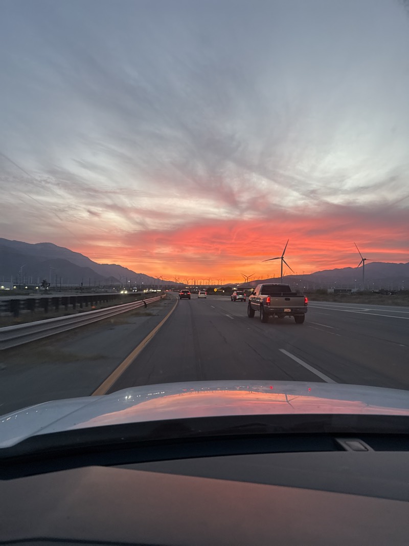 The image depicts a multi-lane highway in the United States, specifically in the vicinity of Desert Hot Springs. The view is from inside a vehicle, showing the hood of the car in the foreground. Several other vehicles are visible on the highway, including a truck in the adjacent lane. The sky is dominated by a vibrant sunset, with hues of orange and pink. In the distance, mountains are visible along with wind turbines, indicative of a wind farm. A roadside barrier is present on the left side of the highway.