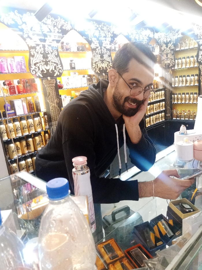 The image depicts the interior of a perfume or fragrance retail store in Unknown, Unknown. An adult male, with a beard and round eyeglasses, is positioned in the mid-ground, leaning against a glass display counter. He wears a black hooded sweatshirt with white drawstrings, smiles towards the viewer, and rests his left hand on his cheek. His right hand holds a silver smartphone. The background features multiple wall-mounted shelves stocked with various perfume and fragrance bottles. Prominently displayed are numerous rows of uniform gold-colored bottles, many bearing white Arabic script. Other shelves contain diverse colorful bottles. The shelving units are adorned with black panels featuring intricate white and gold ornate patterns, suggesting a decorative theme. On the transparent glass display counter in the foreground, a clear plastic water bottle with a blue cap and a tall white bottle with a pink cap are visible. Beneath the glass surface, several boxed items are displayed, including what appear to be small lighters and a wristwatch, alongside a dark, rectangular object with a handle. The scene is brightly illuminated by overhead artificial lighting.