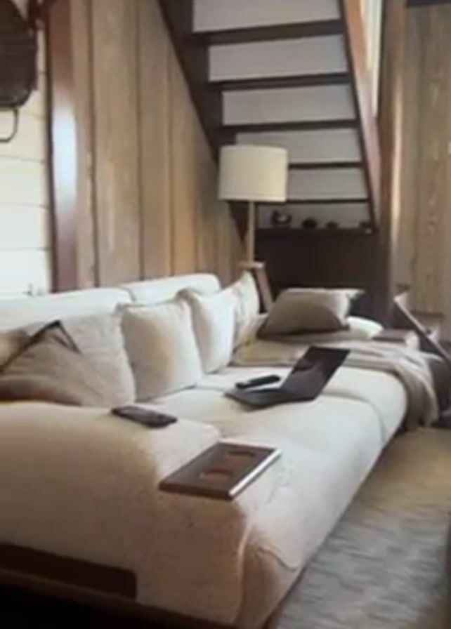 living room with rustic decor. The walls are paneled with light-colored wood. There's a large, light-colored sofa with multiple pillows and a throw blanket. A laptop, phone, and remote control are on the sofa. A round coffee table sits in front of the sofa, and there's a staircase in the background. The video pans to show a fireplace with a fire burning inside, along with decorative items on the mantelpiece, including a clock, a wooden box, and a lamp.
