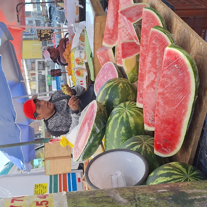 A vibrant outdoor market scene features a man in a red cap eating grapes amidst a display of watermelons. The watermelons are both whole and cut into large slices, some wrapped in plastic. Another person is visible in the background near a selection of oranges and peaches. A sign displaying prices and measurements in Spanish. Various objects, including a white container lid and a part of a structure, are present. The image is shot from a slightly rotated perspective.