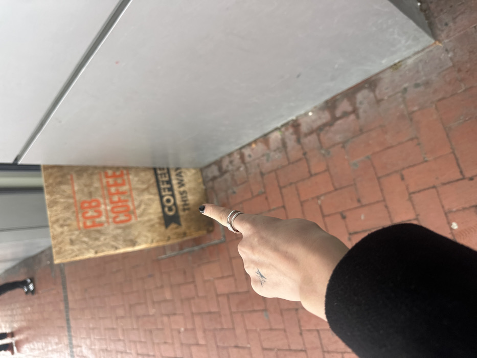 A close-up, ground-level photograph depicts a human hand pointing forward on a brick pavement. The fair-skinned right hand, emerging from a dark, possibly black, coat cuff, extends with its index finger directed towards a freestanding sign. The index finger features black nail polish and two silver rings. A small, faint asterisk-like tattoo is visible on the dorsal side of the hand, near the metacarpophalangeal joint of the thumb. The object of focus is an A-frame sign constructed from light-brown oriented strand board (OSB) or plywood. The sign displays "FCB COFFEE" in stacked orange capital letters at the top. Below this, a black banner contains the word "COFFEE" in white capital letters with a small right-pointing arrow, followed by "THIS WAY" in white text. The sign stands on a red brick pavement laid in a herringbone pattern, showing some discoloration and dampness. Adjacent to the sign, on the right, is a smooth, light grey building facade with a horizontal seam. In the blurred background, the lower legs and feet of at least two individuals are discernible on the pavement, one wearing black trousers and white-soled athletic shoes. This scene is located at 15 High Street, Tonbridge, within the Tonbridge and Malling district, United Kingdom, indicating the precise address of FCB Coffee.