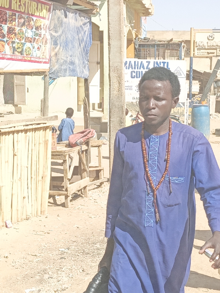 This image depicts an outdoor street scene in Hotoro South, Nigeria, under bright daylight. In the foreground, positioned slightly right of center, an adult male with a dark complexion and short, dark hair stands or walks. He wears a long-sleeved, royal blue tunic adorned with light blue embroidery on the chest and a long strand of reddish-brown wooden beads with tassels around his neck. His left hand holds a dark, possibly black, object, while his right hand holds a light-colored, rectangular object. His gaze is directed towards the left side of the frame. The environment is characterized by a dusty, unpaved ground. To the left of the foreground subject, a structure made of vertical bamboo-like slats is visible, with a small red item on the ground nearby. Further back and to the left, a smaller individual wearing a blue garment is partially visible, seated or crouched behind two rough wooden tables, one slightly higher than the other. A red bag or satchel rests on the higher table. In the background, various urban elements are present. A banner for "MO RESTAURANT" with food images hangs on the far left, next to a light blue tarp. Behind the foreground subject, a large white sign for "MAHAZ INT'L CO." is visible, along with contact numbers. Further right, another white sign partially reads "NA LOG". Buildings with varying facades, some appearing to be under construction or in a state of disrepair, line the street. A blue plastic barrel is situated in the far right background. The sky is clear and blue.