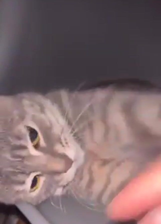 A person's hand, partially covering the cat, withdraws to reveal a gray tabby cat lying on a gray chair. The cat looks at the camera.