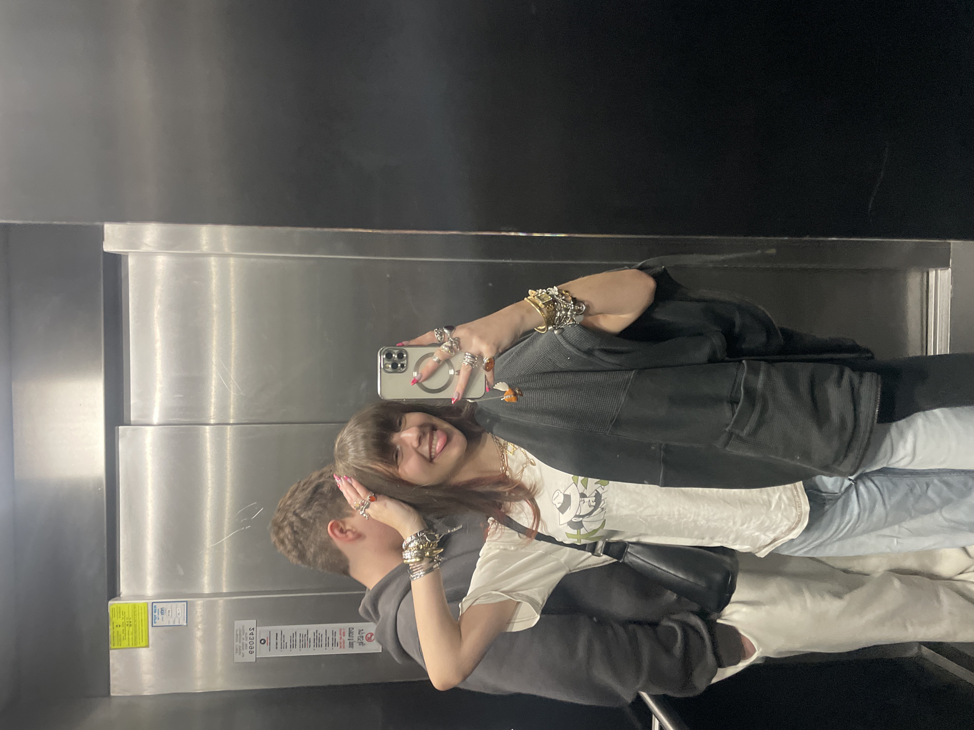 The image depicts two individuals in an elevator. One person, presumably female, is holding a phone and taking a selfie. She has brown hair, is wearing a white t-shirt with a graphic print, a black jacket, jeans, and numerous rings and bracelets. A second person, likely male, is standing next to her. The interior of the elevator is stainless steel with safety information stickers visible on the left side. The elevator is possibly in Raanana, Israel, but there is no confirmation of this fact.