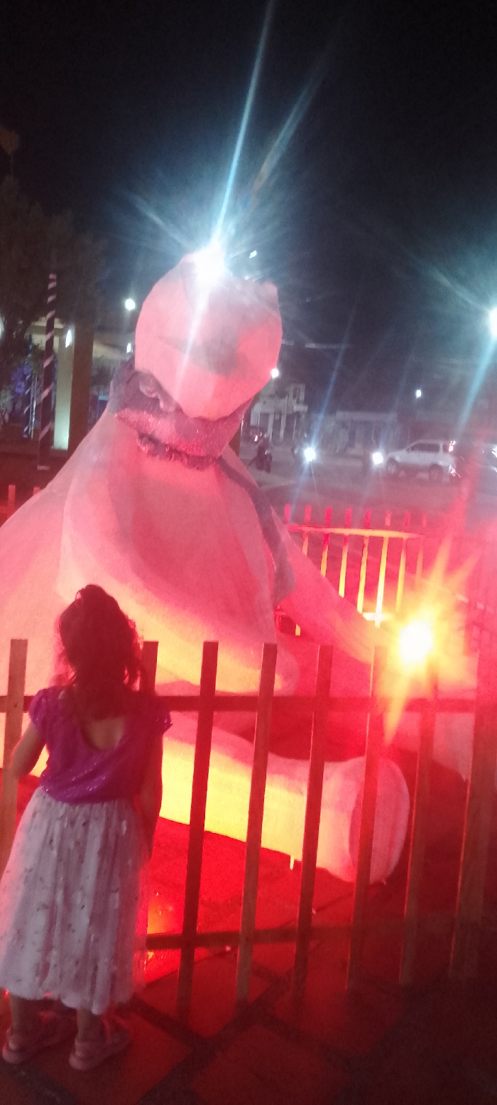 The image depicts a nighttime scene in the city of La Fría, Venezuela, characterized by artificial lighting. In the foreground, a young child, viewed from behind, stands observing a large, illuminated installation. The child has dark hair and wears a purple/magenta sparkly top and a light-colored, patterned skirt, with light-colored shoes visible on their feet. A dark wooden barrier, composed of vertical slats, separates the child from the central subject. The central subject is a voluminous, light-colored inflatable or sculpture, possibly fabric, illuminated from below by strong red and yellow lights, rendering it reddish-pink. It exhibits a rounded, amorphous form with a distinct "neck" area adorned with a darker, textured or ruffled material. Bright light sources within or around the installation create prominent starburst flares in the upper and lower right portions of the image. The background reveals an urban environment under a dark night sky. Visible elements include architectural structures, possibly buildings, with some interior or exterior lighting. A street or plaza is discernible, populated by multiple vehicles, including a white SUV and what appear to be motorcycles, identifiable by their headlights and taillights. Trees with sparse lighting are visible on the left. The overall scene is dominated by the artificial illumination, casting a red hue across the lower and central parts of the image.