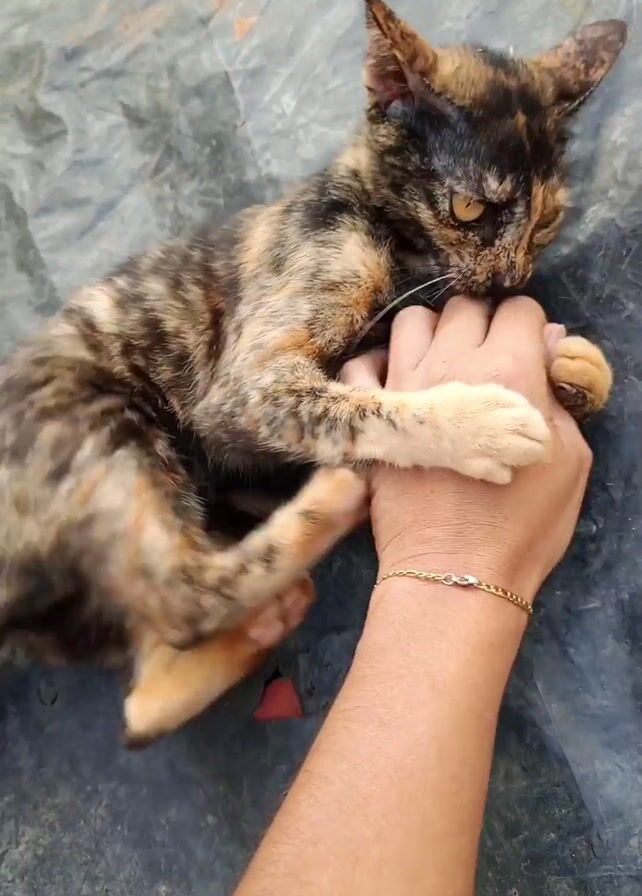 - "person holding a tortoiseshell kitten, which is laying on its back and biting and clawing at the person's hand" by FM-eTwu93, licensed under CC BY 4.0