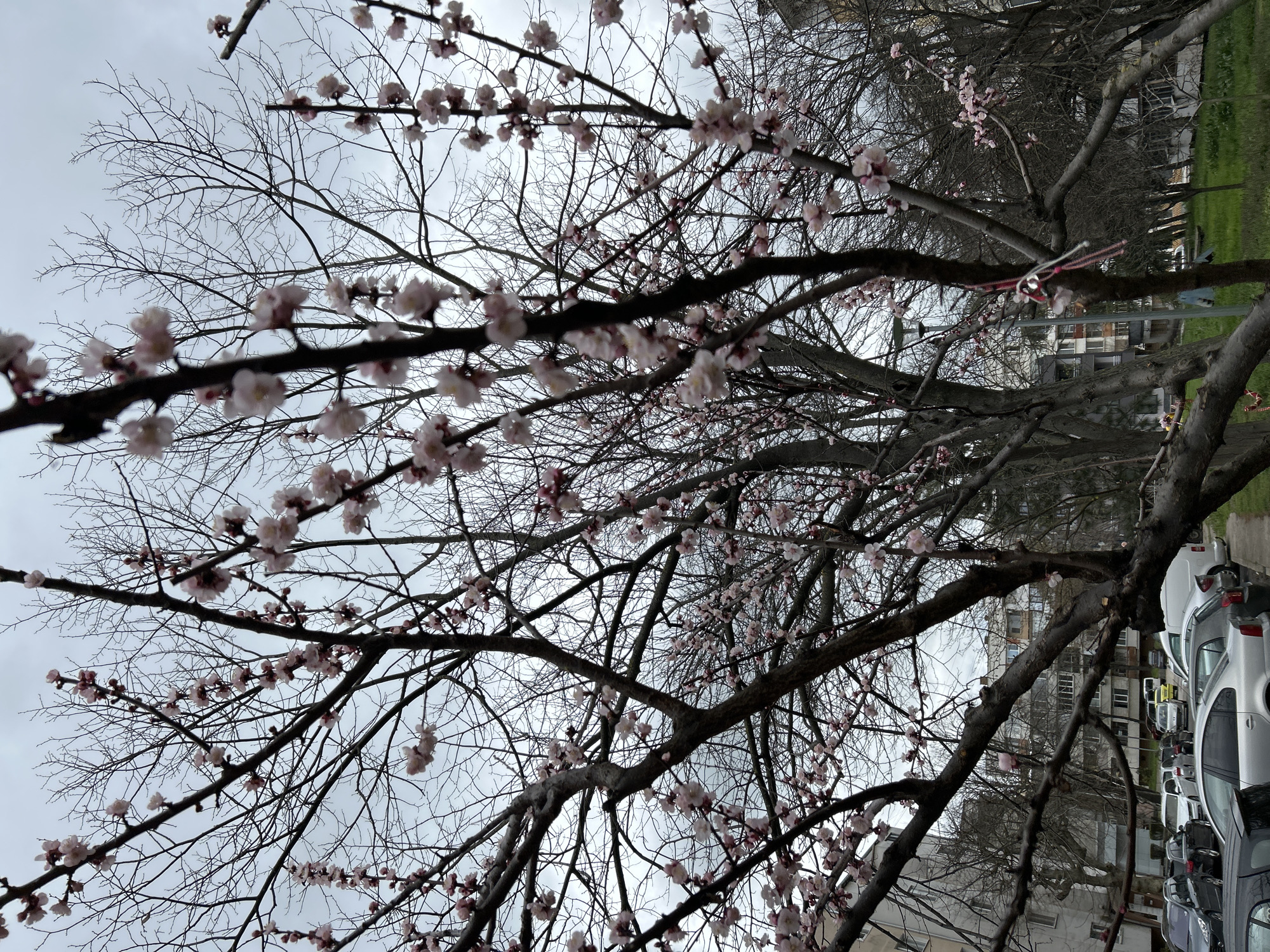 The image depicts an outdoor scene in the city of Kozloduy, Bulgaria, on an overcast day. In the foreground and mid-ground, a deciduous tree exhibits numerous small, light pink blossoms on its otherwise bare branches, signaling early spring. A red and white braided string, indicative of a Martenitsa, is tied around a branch of a tree to the right of the central blooming tree. In the background to the left, a multi-story residential building with visible windows and balconies stands. Below this building and extending into the mid-ground, a row of approximately ten parked passenger vehicles of various colors (including silver, black, and white) are visible on a paved surface. To the right, another residential building is partially visible beyond a patch of green grass and additional bare trees. A street light pole is also present in the mid-right background. No individuals are depicted in the scene.