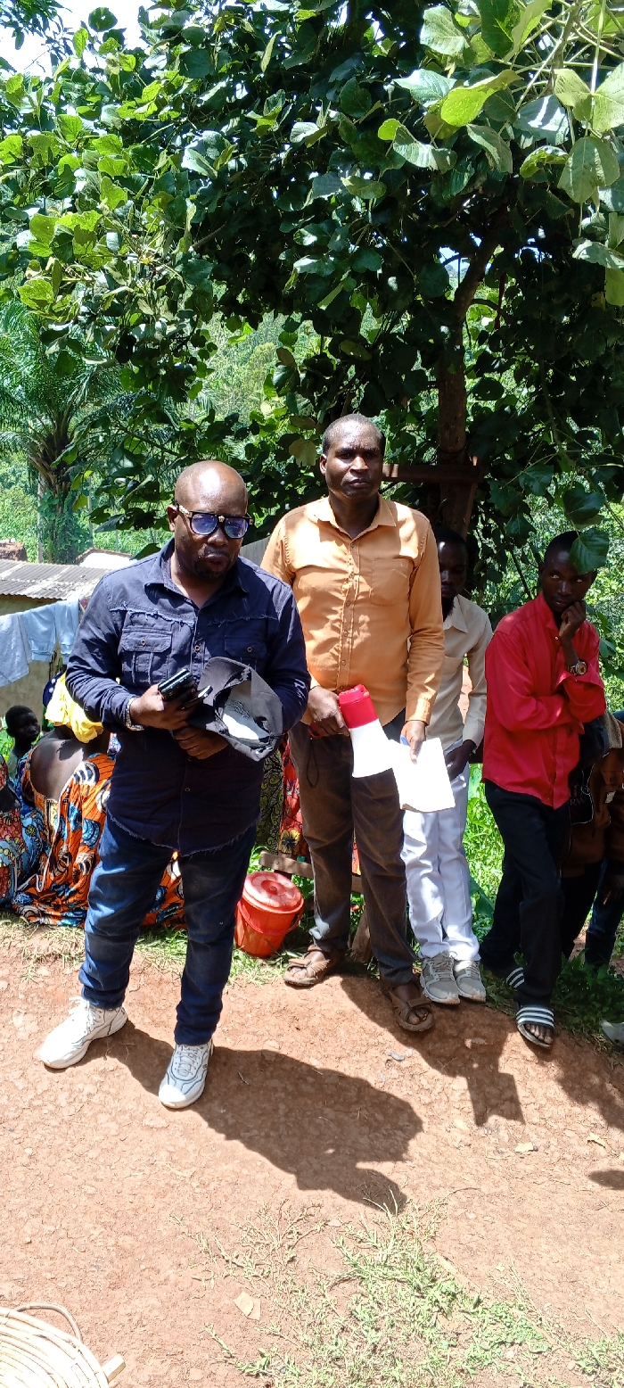 A group of four men stand on a dirt surface under a tree. The first man wears a blue shirt, jeans, and white shoes. He holds a cap and phone. The second man wears an orange shirt and brown pants, holding a megaphone. Behind them is a man in a white shirt and pants, and another in a red shirt and black pants with sandals. Some people sit and clothes hang in the background.